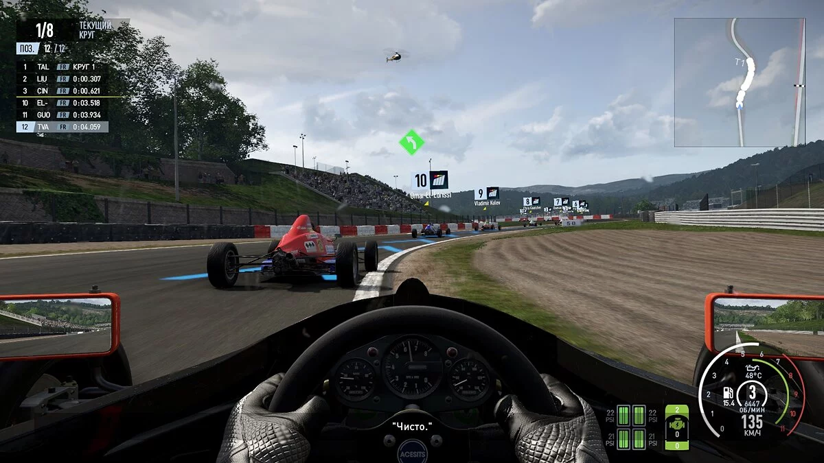 Отдельный меню посвящено настройкам сложности. Тут есть все: отключение или перестановка любых элементов интерфейса, комментирование действий споттером, слежение за исполнением правил специальной дирекцией судей (подрезали, обогнали по «зеленке» — будьте добры вернуться на предыдущую позицию), автоматизированные помощники, система повреждений и еще куча разных опций.