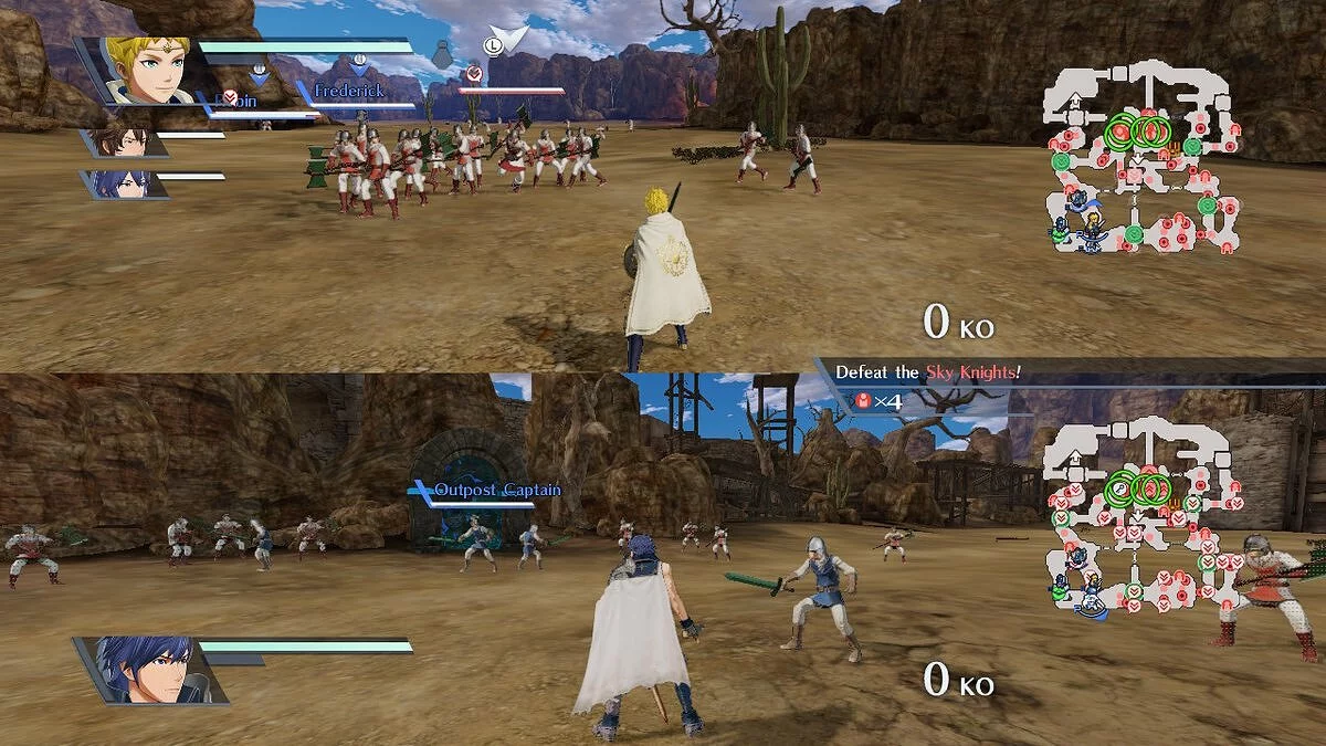 Кроме постоянного экшена и сражений в игре есть элементы стратегии, унаследованные кроссовером от серии Fire Emblem. Чтобы успешно пройти уровень, представляющий собой огромную локацию с множеством важных стратегических точек, нужно правильно распределить союзников. Сделать это можно на специальной карте. На ней кроме ключевых объектов и маркеров квестов вы можете видеть, к каким классам принадлежат солдаты противника. Нужно учитывать, что в отдельных зонах ваши герои могут быть менее эффективными, потому что их стиль боя не подходит для борьбы, например, с мечниками. Больше всего это похоже на игру в камень, ножницы, бумага. Только вместо классических элементов у вас маги, лучники и мечники.