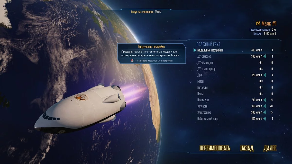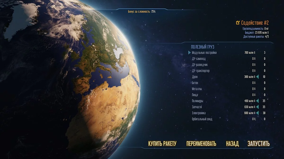 Тут же можно выписать еще одну ракету с Земли, если у вас есть деньги, с дополнительными ресурсами и модулями: