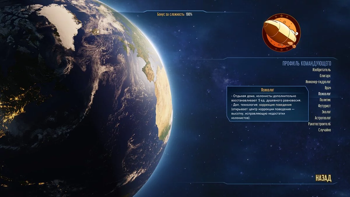 Дальше задается специализация командующего колонизаций Марса — можно быть изобретателем, психологом, астрогеологом или просто олигархом. У каждой настройки свои плюсы минусы: