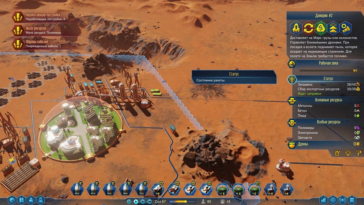 Рабочей лошадкой в Surviving Mars выступают многочисленные универсальные дроны, которые возят ресурсы, обслуживают здания, чинят и строят. Управляют ими из ракеты или стационарные или передвижные контрольные центры, причем радиус действия ограничен: