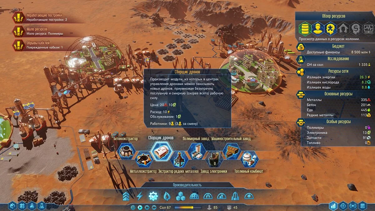 Вдобавок, некоторые ресурсы добываются автоматически, вроде воды или бетона, а другие требуют колонистов для добычи или производства. Это было бы терпимо, если бы базовые ресурсы добывались автоматически, а вторичные требовали присутствия людей. Но в Survivng Mars половина на половину, так что нельзя постоянно жить в одном месте и производить товары, а все базовые ресурсы держать «на удаленке», перенося места их добычи после исчерпания месторождений. Приходится переезжать вместе с ними.