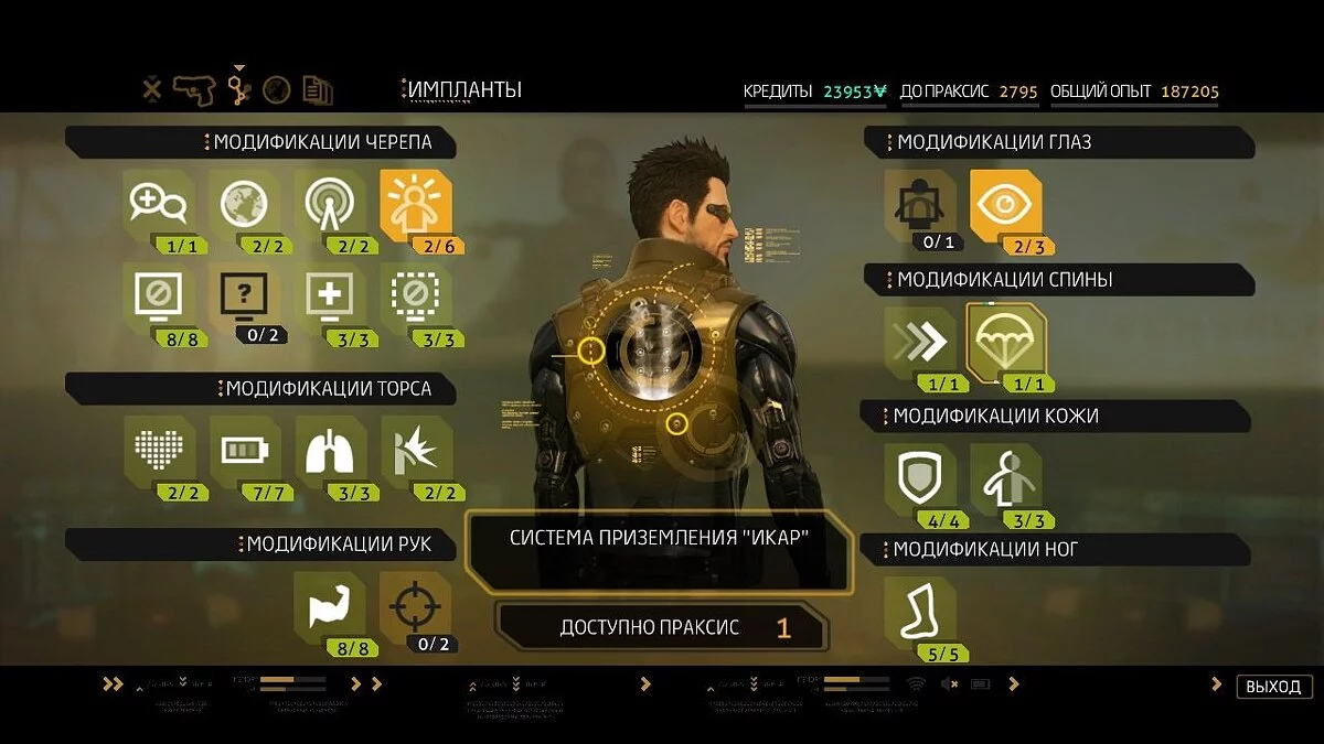 Полученные параксис-элементы мы тратим на прокачку персонажа. Осуществлять ее мы можем как угодно — то есть не только усиливать броню или маскировку, а взять и оттуда и оттуда по кусочку. Несмотря на большое количество имплантов среди них нет бесполезных, и каждый из них, возможно усилить до максимума, что кстати очень выручает в опасных ситуациях. Сама игра представляет куда больше возможностей для стелс-режима, чем для режима «убить всех». Огромные локации, в которых разработчики спрятали потайные лестницы, входы и выходы — на то, чтобы все это исследовать и облазить, уйдет не один час. И это подчеркивает не только хороший дизайн уровней, но и отличный тестинг игры — разработчики постарались, чтобы все работало как надо. Правильно выбрав стратегию прокачки персонажа можно без труда проходить каждый уровень игры, а перед началом новой миссией можно прикинуть свои тактические возможности и использовать их соответственно текущему раскладу.