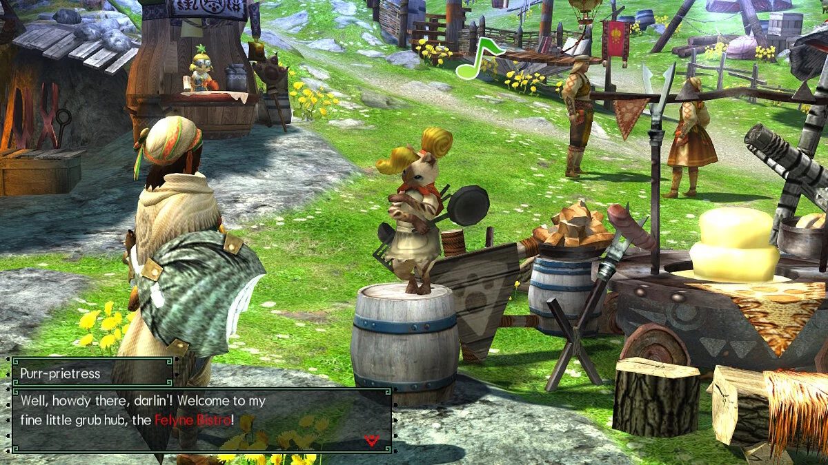 После создания нового персонажа, вас встретит первая игровая деревня. В живописном поселение живут добродушные торговцы, мастера клинков, коты-повара и кузнецы. Со всеми персонажами можно пообщаться и получить от них пересказ курса «Охота на монстров для чайников».