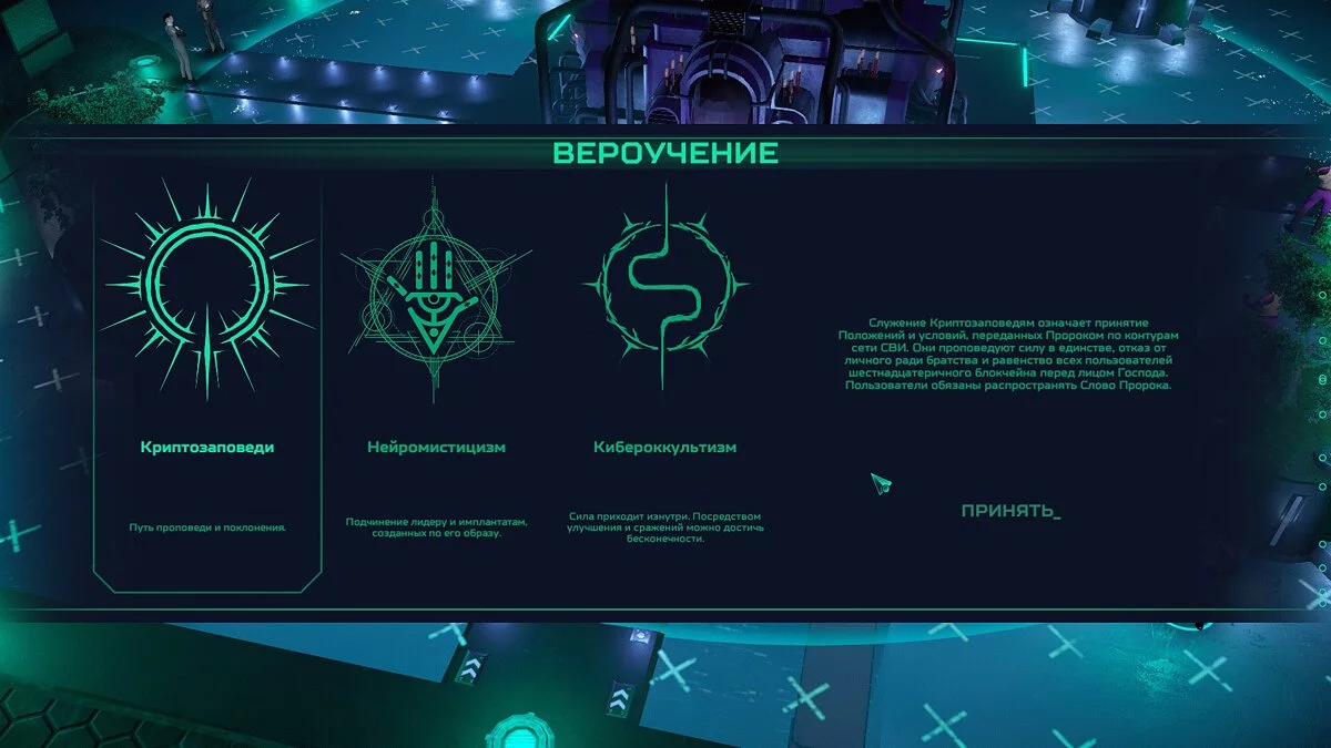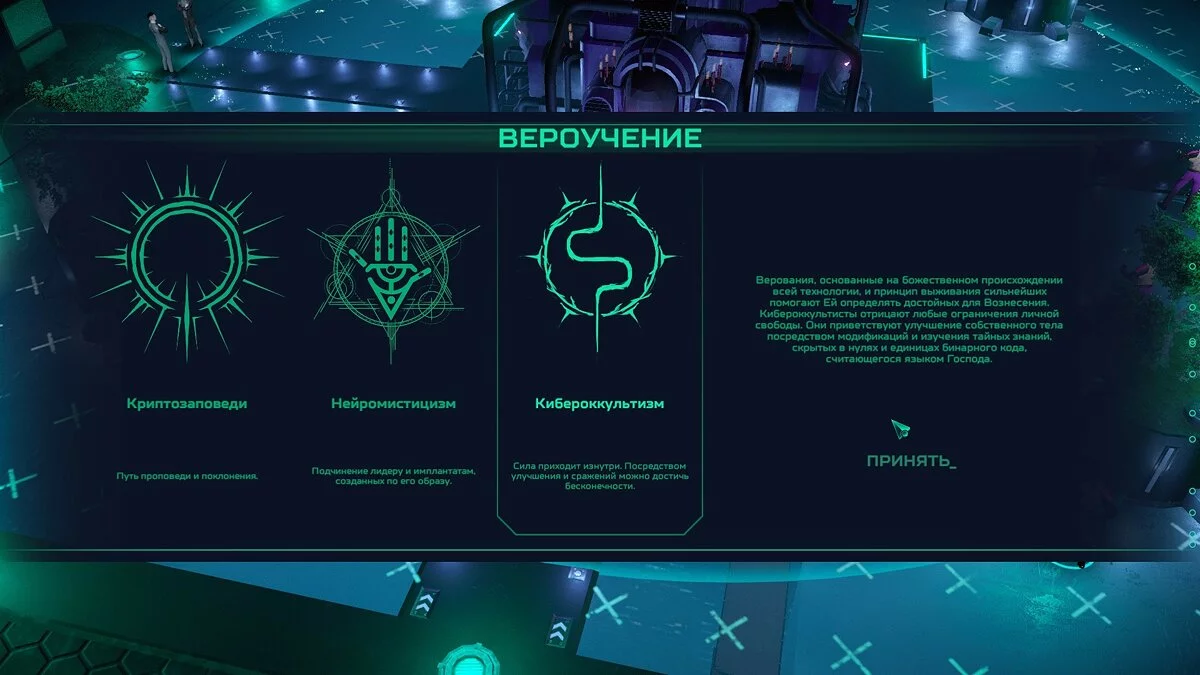 С религией Re-Legion хоть и перекликается по названию, но ничего общего не имеет. Игрок строит классические культы или экстремистские организации, на выбор доступно три философии: помешанные на имплантатах, технологиях или силе. Все это также окажет небольшое влияние на геймплей.