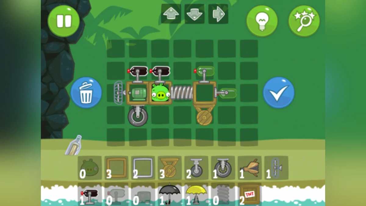 У «Плохих свиней» нет огромной рогатки для быстрого перемещения по уровню, поэтому средства передвижения нам придётся строить самим из подручных средств: деревянных ящиков, газовых баллонов, колёс, динамита и так далее. К сборке транспорта нужно подходить с умом, иначе наш зелёный друг просто не доедет до финиша, а проигрыш нам, вовсе, не нужен. Можете быть уверены, что эта игра заставит вас пошевелить вашим серым веществом, ну а если вы уже совсем обленились, то вы можете заглянуть в справочник с подсказками или же нанять механиков, которые сделают за вас всю работу.