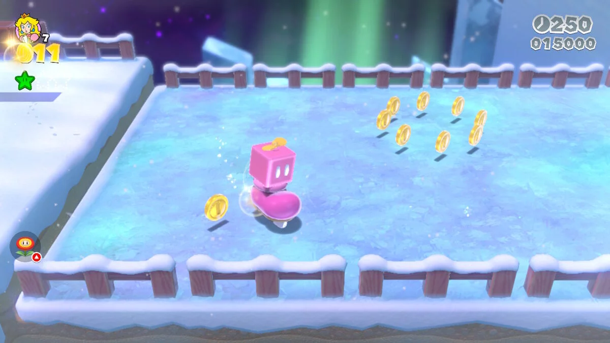 Костюмы вообще играют особую роль. Находим цветочек, грибочек, листик или колокольчик — и превращаемся в улучшенную версию персонажа. Отдельного упоминания достойна одёжка котика. С помощью неё запросто можно забраться по стене и найти спрятанную платформу с секретом, перебраться через вертикальную стойку или сразить обидчика острыми когтями. Из всех доступных вариантов этот — настоящая имба, поэтому в большинстве случаев ему и отдаёшь предпочтение.