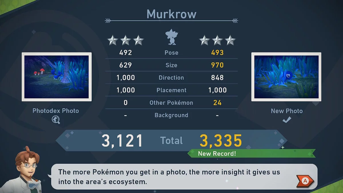 Из отснятых фотографий нужно выбрать лучшие и отправить на оценку профессору Миррору. Чем крупнее получился покемон на фото, тем лучше. Также важно поймать покемона в какой-нибудь необычный момент или, например, заснять его, когда он обратил на вас внимание — все это тоже влияет на оценку.