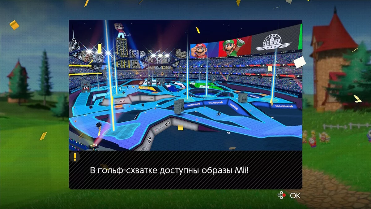 Сюжет в спортивных играх — дело третье, поэтому в большинстве случаев мы бы не стали на нем подробно останавливаться. Но к Mario Golf: Super Rush совсем другие требования. К сожалению, тут игра разочаровывает: одиночная кампания уж очень слабенькая. Беда даже не в том, что сюжетка больше похожа на большой обучающий уровень, а что играть приходится не за известного усатого героя, а всего лишь за персонажа-аватара Mii. Если в Miitopia такой подход был основой геймплея (обзор можно прочитать тут), то от игры с именем Марио в заголовке ждешь гораздо большего. Странное решение.
