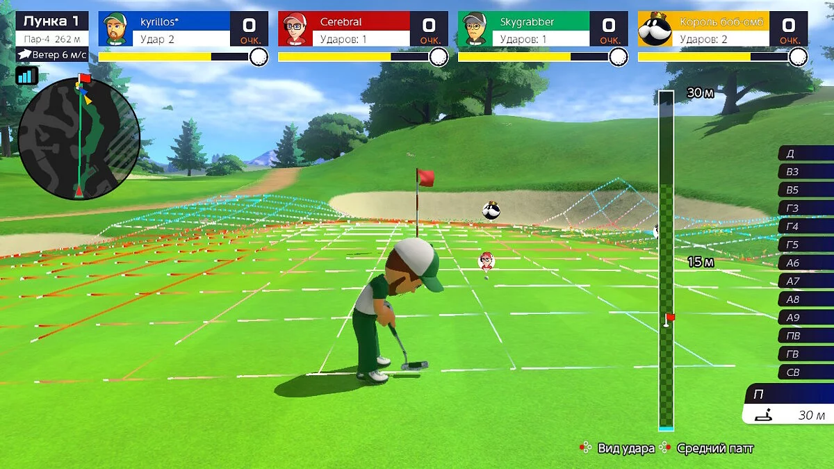 Стоит отметить, что в зависимости от режима игры геймплей существенно отличается. Так, помимо классического режима можно поиграть в блиц-гольф или гольф-схватку. Оба режима напоминают аркаду. В блиц-гольфе нужно не только бить по мячу, но еще и бежать к месту его падения. Вы уже не увидите, как красиво (или не очень) летит мяч, но зато сможете потолкаться с противниками, сбить их мяч в сторону или попасться в ловушку. В то же время гольф-схватка больше напоминает классический мультиплеерный режим с захватом флага. Суть его такова, что нужно первым попасть в три из девяти лунок, которые расположены на едином открытом поле. Как только один из четырех возможных игроков закрывает лунку, она исчезает.