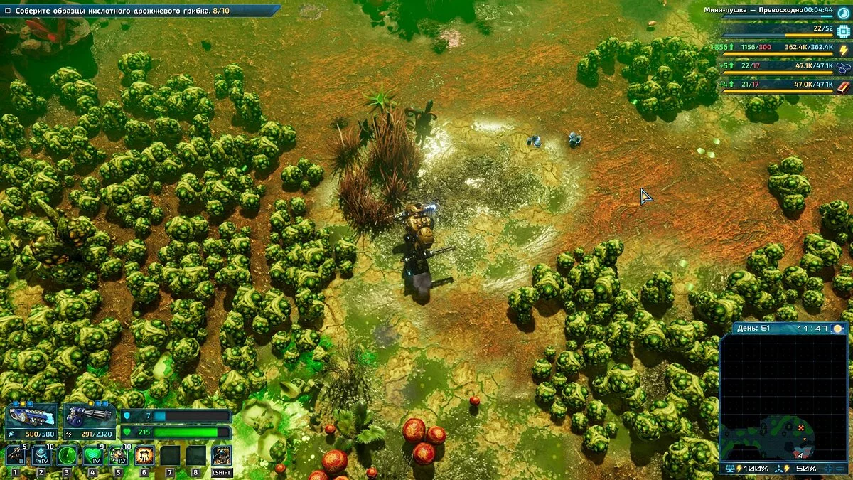 Чем больше с ними взаимодействуешь (убиваешь или исследуешь биосканером), тем больше узнаешь и приобретаешь разные бонусы (больше ресурсов за убийство, выше урон, уязвимость к оружию и так далее). И если с фауной все понятно, то агрессивная флора — необычная геймплейная механика The Riftbreaker, особо заметная в болотном биоме. Его агрессивную грибницу, стреляющую кислотой и заполняющую всё подряд, приходится буквально выжигать.