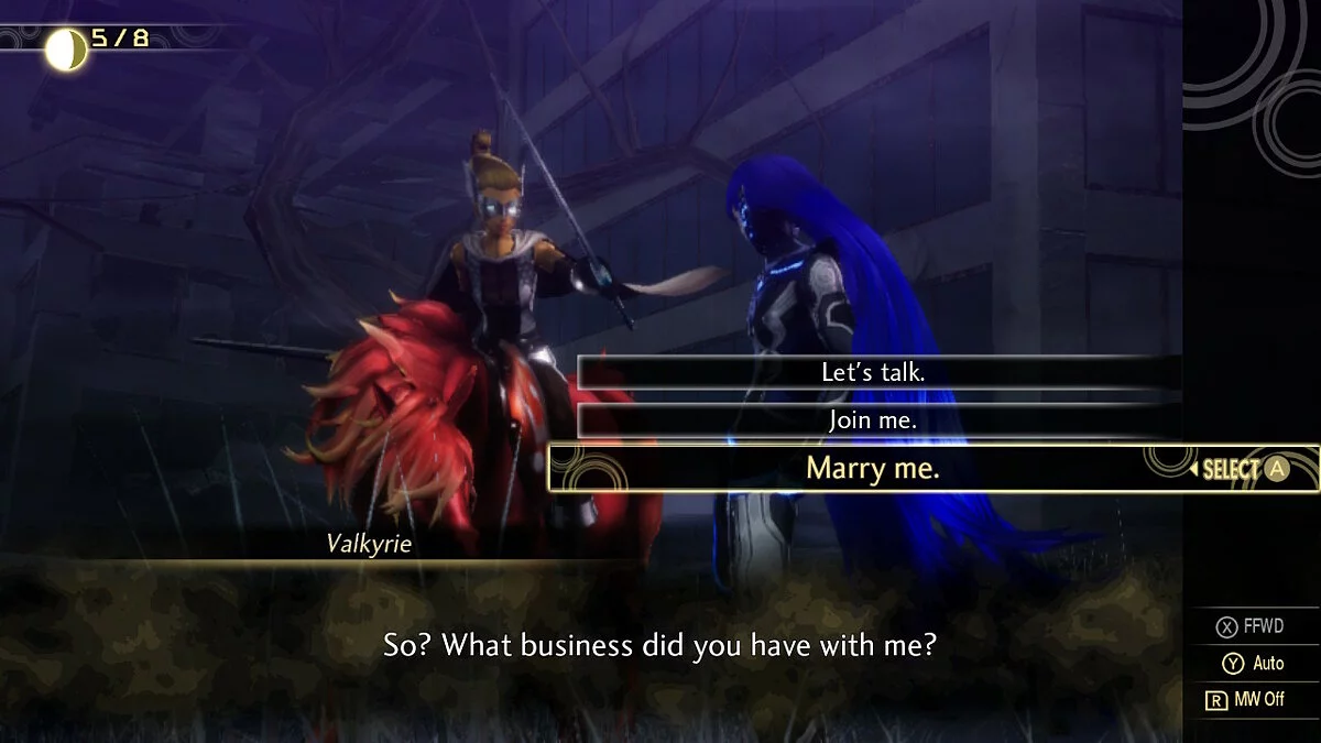 Одна из сильных сторон боевой системы — вербовка демонов. В Shin Megami Tensei V можно заговорить с любым противником, а если он ответит, попытаться его привлечь на свою сторону. Вербовка демонов представляет собой своеобразную мини-игру с изрядной долей юмора. Цель — задобрить демона, выбирая предложенные варианты ответа или отдавая что-то ценное. При этом никогда не угадаешь, как отреагирует демон на ту или иную фразу. Один раз, например, можно было предложить валькирии выйти замуж за главного героя. Недолго думая воительница отправила протагониста во френд-зону, но к отряду все-таки присоединилась.