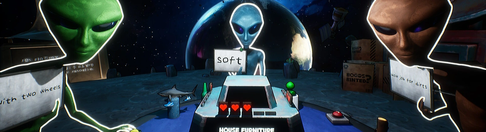 Кооперативная карточная игра, в которой инопланетяне не изучают Землю, а собираются на Луне ради безумных настольных баталий. Каждый участник — воплощение абсурдного галактического юмора, где правила меняются по настроению, а победа нередко достаётся самому наглому. Всё пропитано духом странных шуток, кривых улыбок и весёлого хаоса.