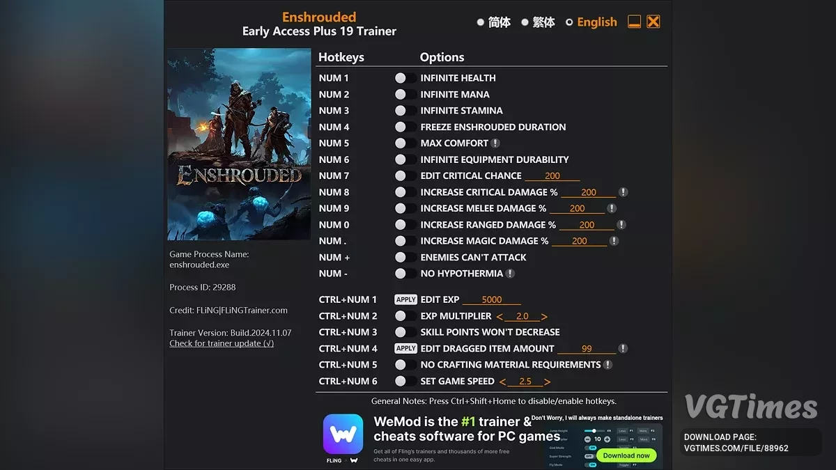 Функции и команды: Numpad 1 : Бесконечное здоровье. Numpad 2 : Бесконечная мана. Numpad 3 : Бесконечная выносливость. Numpad 4 : Длительность заморозки в оболочке. Numpad 5 : Бесконечная долговечность экипировки. Numpad 6 : Настроит ...