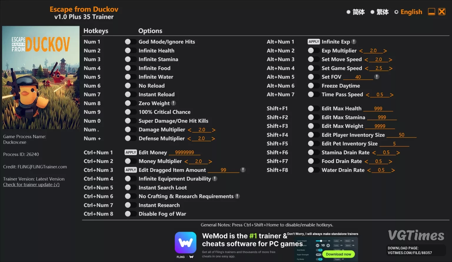 Функции и команды: No Thirst And Hunger Decrease — Нет уменьшения жажды и голода. Bullets No Decrease.— Патроны не уменьшаются. Character Zero Weight — Нулевой вес персонажа. Game Clock — Игровые часы. Economy Manager — Управление экономико ...