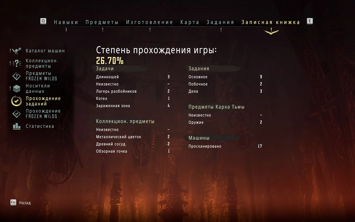 Horizon: Zero Dawn пройдена на 99%. Дополнение The Frozen Wilds пройдено на 100%. Разблокирована Новая игра+ Открыты все локации на карте. Открыты все носители данных. Пройдены все квесты сюжета, дополнительних заданий, дел, испытаний (на золото ...