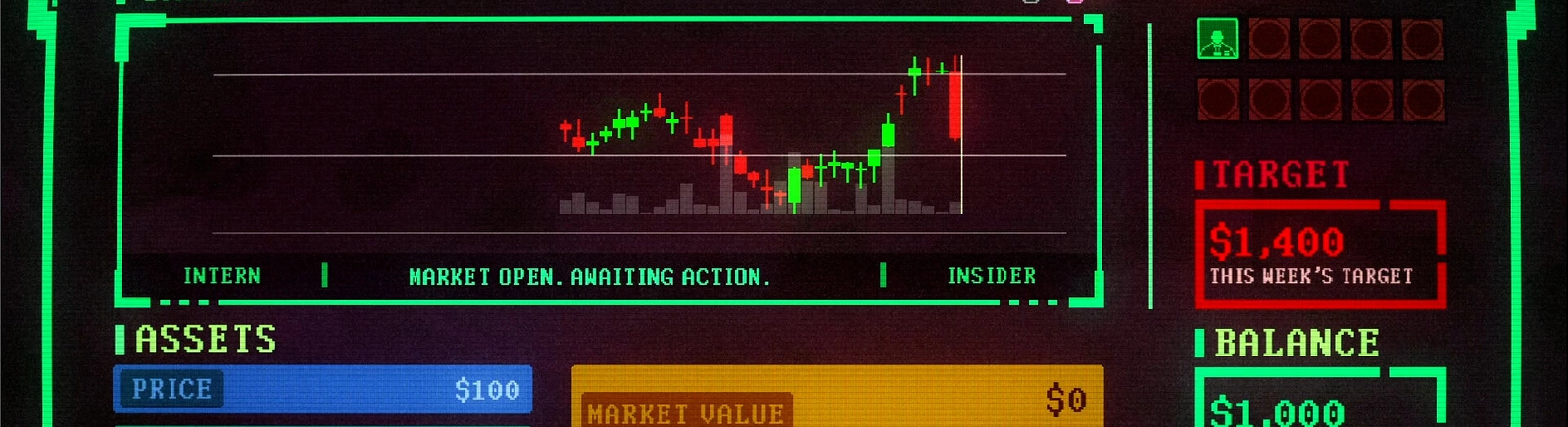 Игрок манипулирует на фондовом рынке, чтобы получить прибыль. Для этого нужно собирать колоду карт, позволяющих менять цены и контролировать реакцию на события. Есть разные персонажи, предлагающие уникальные стартовые наборы и хитрости.