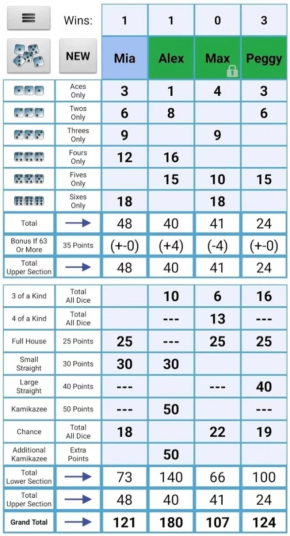 Kamikazee Dice Score Card