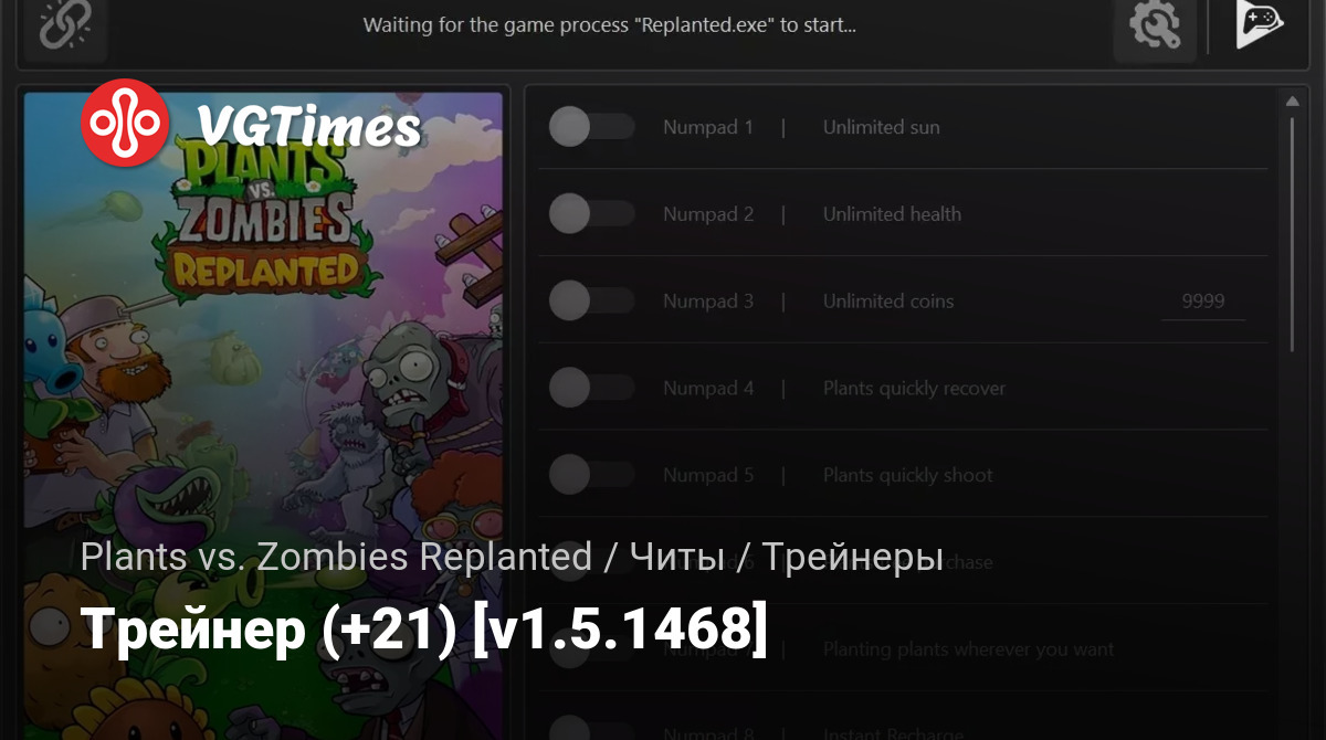 Это неофициальный трейнер для игры Plants vs. Zombies: Replanted.