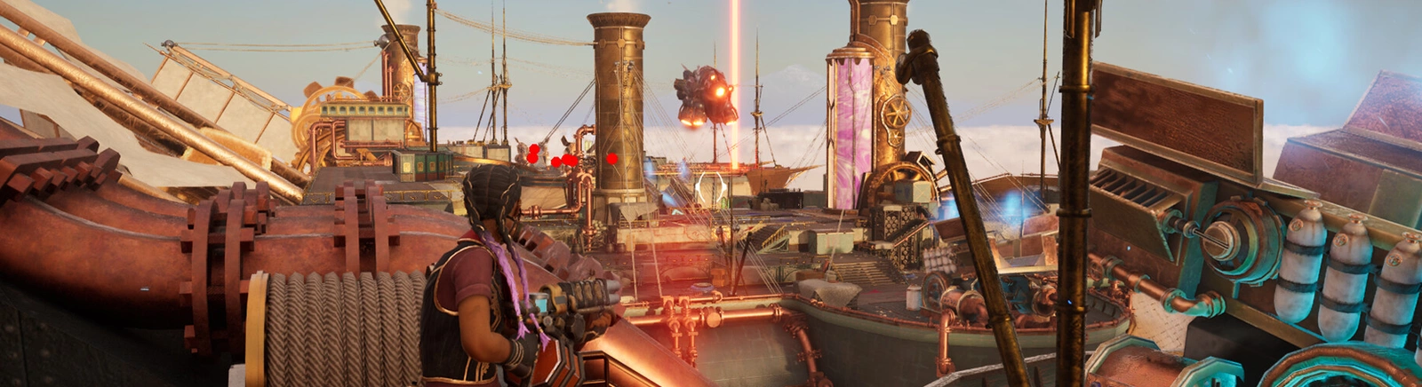 Игрок один или в кооперативе защищает воздушные корабли от роботов-мародеров. Можно перемещаться между судами, чтобы быстро отбить натиск врагов. На заработанную валюту нужно улучшать оружие: есть разнообразные типы стволов и боеприпасов.