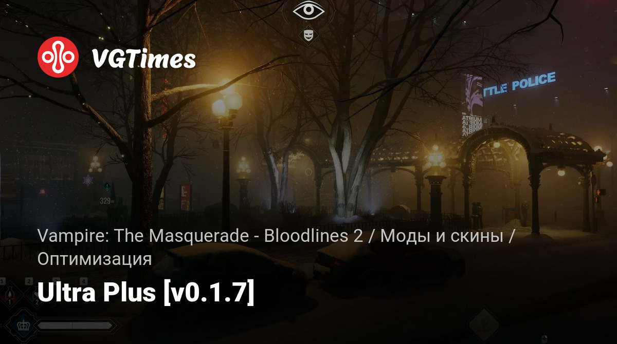 Ultra+ для Bloodlines 2 — модификация, улучшающая графику: уменьшает шум, устраняет выцветший вид и повышает качество изображения. Добавляет возможность управлять раздражающими эффектами, такими как зернистость плёнки, и позволяет включать или отключать генерацию кадров DLSS. Также должна улучшить отклик игры (снизить задержку) и повысить стабильность и производительность.