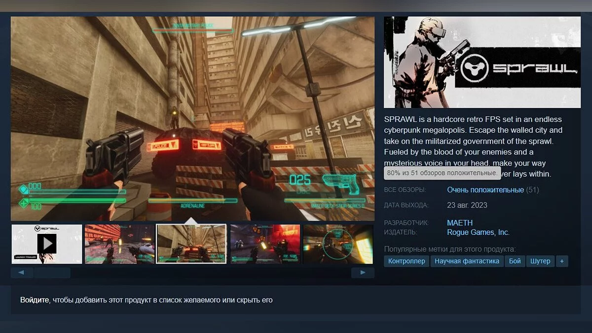 Компания-издатель Rogue Games и студия-разработчик MAETH выпустили в Steam киберпанк-шутер SPRAWL. Первые отзывы — положительные. На момент написания новости проект имеет рейтинг 80%.