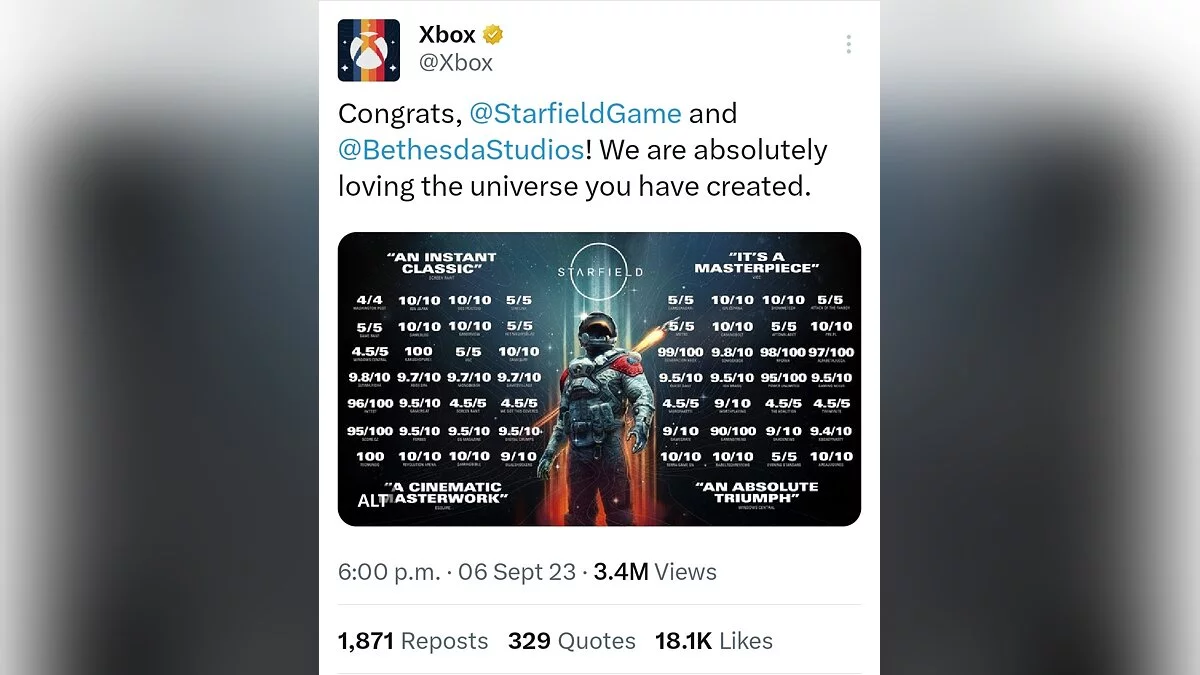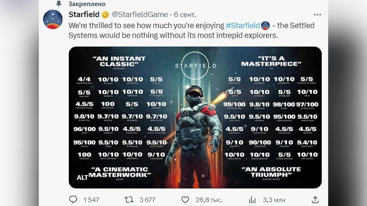 Недавно в официальном профиле Starfield в социальной сети X (Twitter) опубликовали картинку, на которой перечислены множество высоких оценок игры от прессы. Однако некоторые пользователи заметили на ней несоответствие с действительностью.