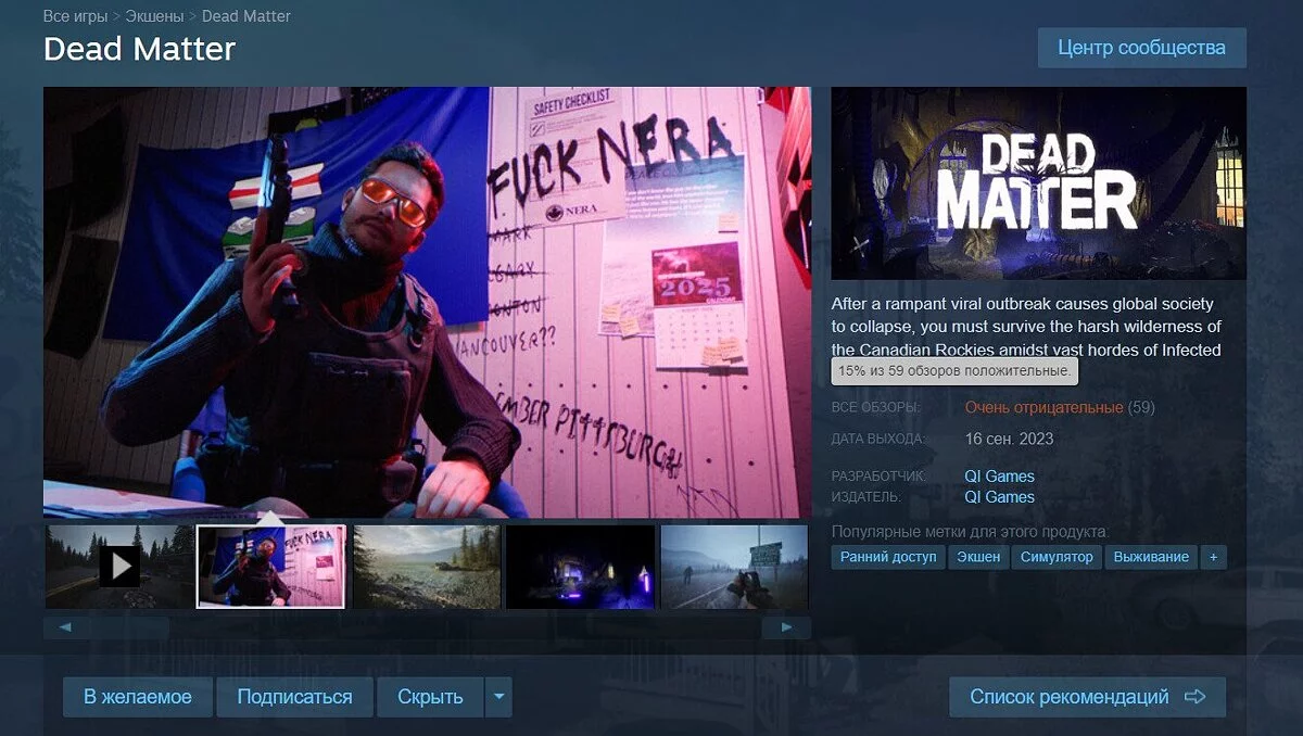 Компания QI Games выпустила в раннем доступе Steam симулятор выживания с открытым миром под названием Dead Matter, который находится в разработке уже больше пяти лет. Примечательно, что в первый же день проект получил очень отрицательные отзывы от геймеров.