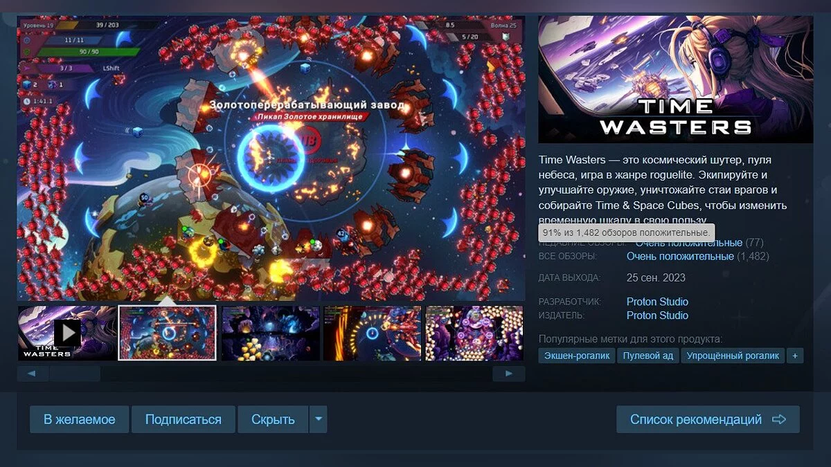 В Steam состоялся полноценный релиз полной версии (1.0) космического шутера с элементами рогалика под названием Time Wasters, который до этого находился в раннем доступе. Сейчас проект имеет полторы тысячи отзывов, 91% из которых положительные. Многие геймеры сравнивают игру с Vampire Survivors.