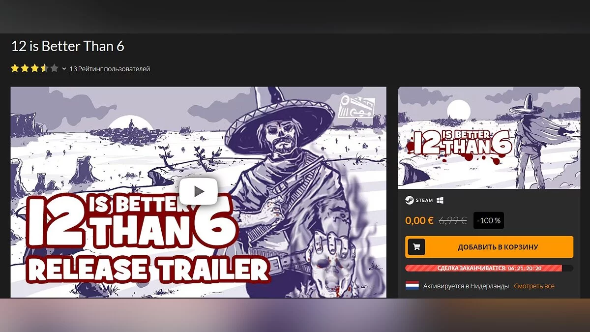 Для Steam бесплатно раздают динамичный шутер с видом сверху в сеттинге Дикого Запада под названием 12 is Better Than 6, который вышел в 2015 году и за это время получил почти три тысячи положительных отзывов от геймеров.