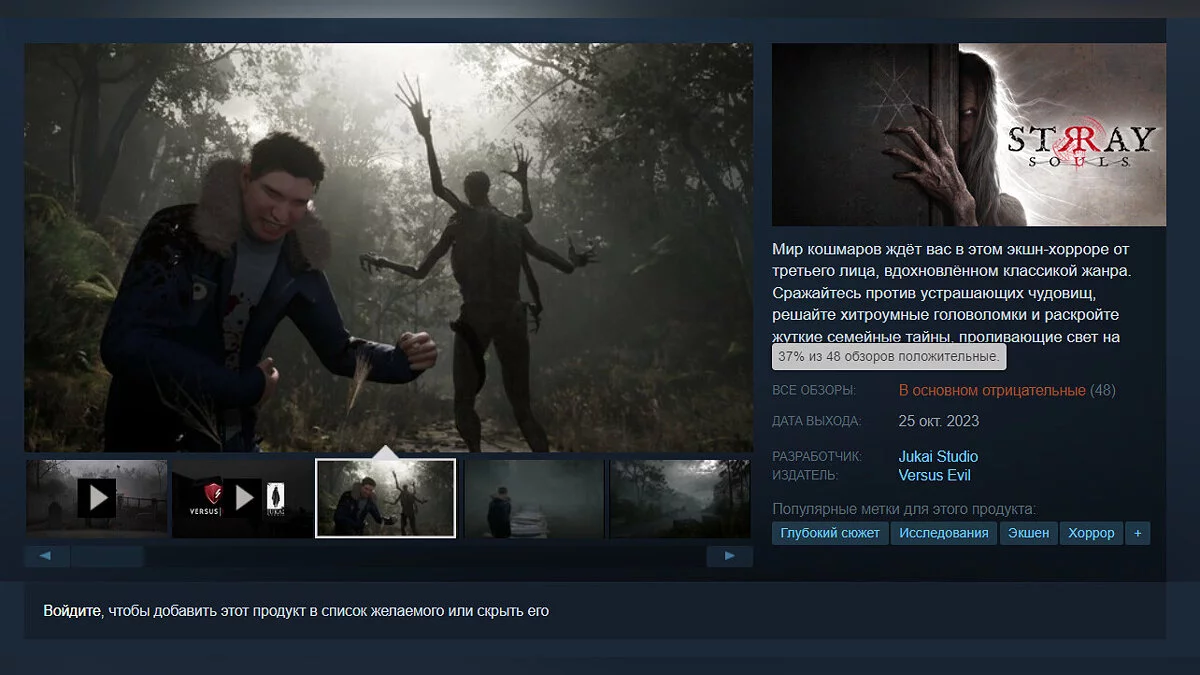 Компания-издатель Versus Evil и студия Jukai выпустили в Steam экшен-хоррор от третьего лица Stray Souls. Примечательно, что проект получил в основном отрицательные отзывы от геймеров (рейтинг 37% на момент написания новости).