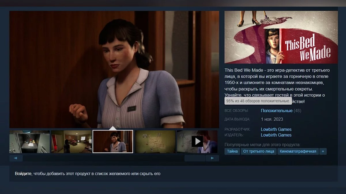 Вчера (1 ноября) состоялся релиз приключенческой игры This Bed We Made, представляющей собой детектив от третьего лица, главной героиней которого выступает горничная отеля. В Steam рейтинг проекта составляет 95%.