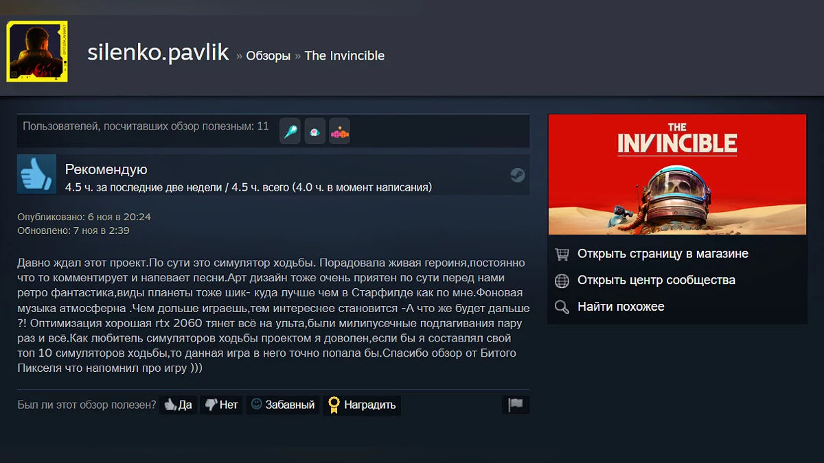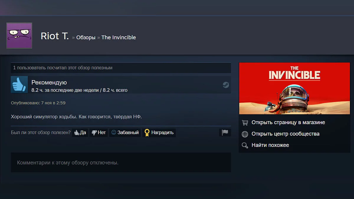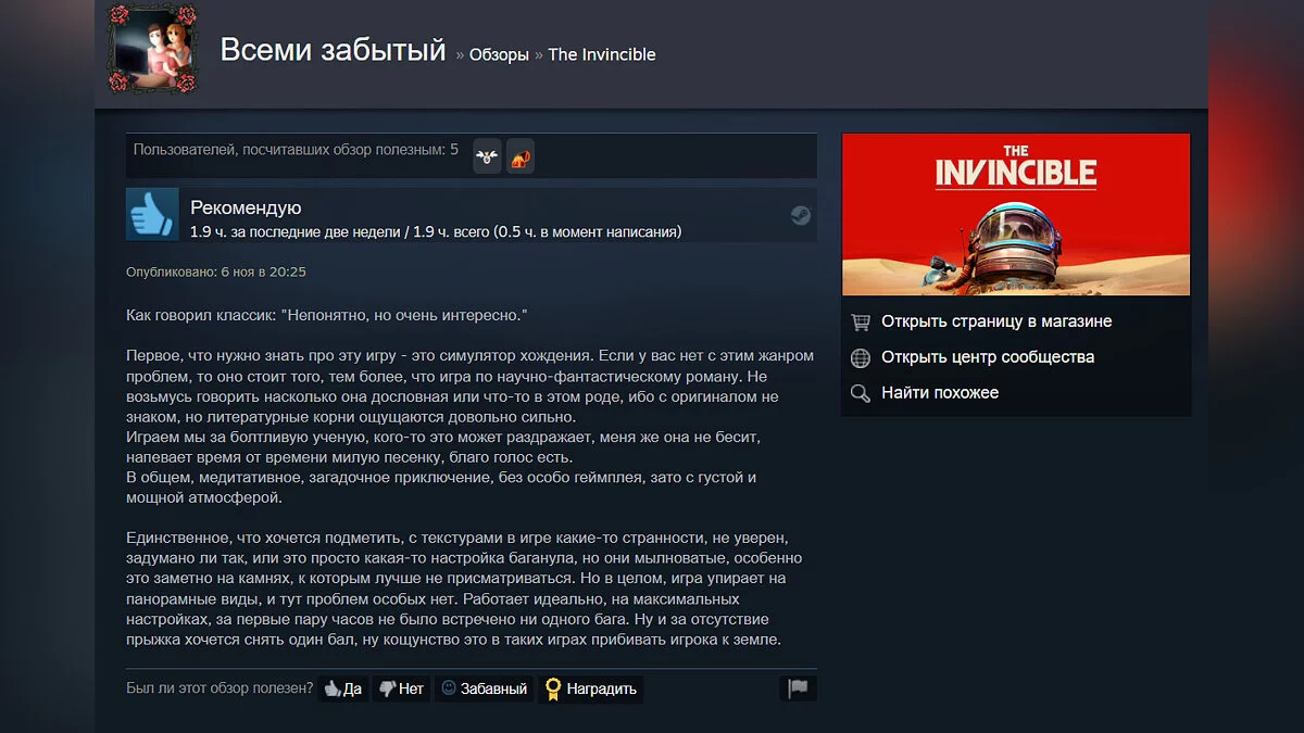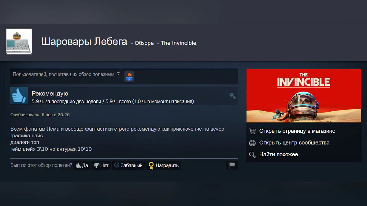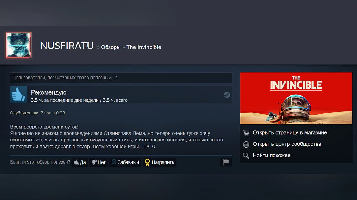 Судя по отзывам, среди главных особенностей The Invincible выделяют атмосферный визуальный стиль, интересные диалоги и захватывающий сюжет.