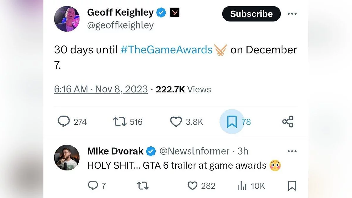 Кроме того, ведущий The Game Awards, Джефф Кейли (Geoff Keighley), ровно в то же время, когда Джейсон Шрайер запостил утечку, опубликовал пост, в котором написал, что до церемонии награждения остается 30 дней (мероприятие пройдет в ночь с 7 на 8 декабря). Возможно, это намек на трейлер GTA 6.
