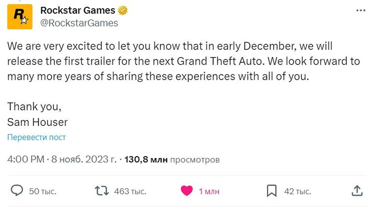 Вчера (8 ноября) Rockstar Games официально анонсировала трейлер GTA 6, что вызвало бурные реакции у геймеров в интернете. Проект еще даже не вышел, но уже установил новый рекорд. Сообщение от разработчиков стало самым популярным игровым твитом в истории.