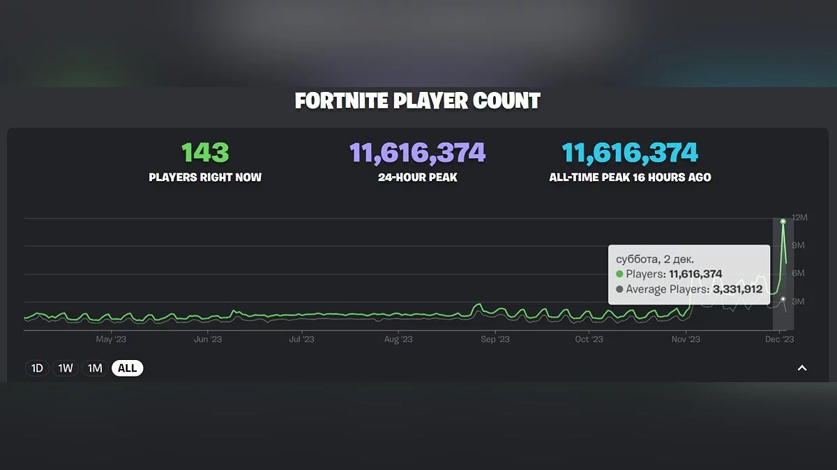 По данным сервиса fortnite.gg, в игре одновременно находилось 11 616 000 человек.
