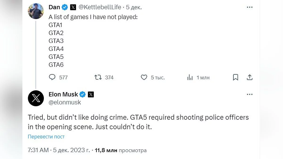 «Я как-то пробовал, но не люблю совершать преступления. GTA 5 требовала расстрела полицейских в первой сцене. Я просто не мог этого сделать», — заявил Илон Маск в социальной сети X (Twitter), комментируя одно из сообщений.
