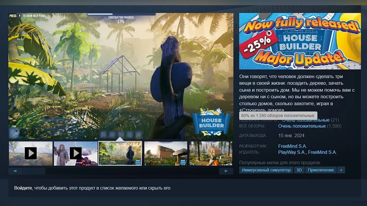 Купить House Builder в Steam можно за 533 руб с учетом скидки 25% (действует до 22 января). Есть бесплатная демоверсия.