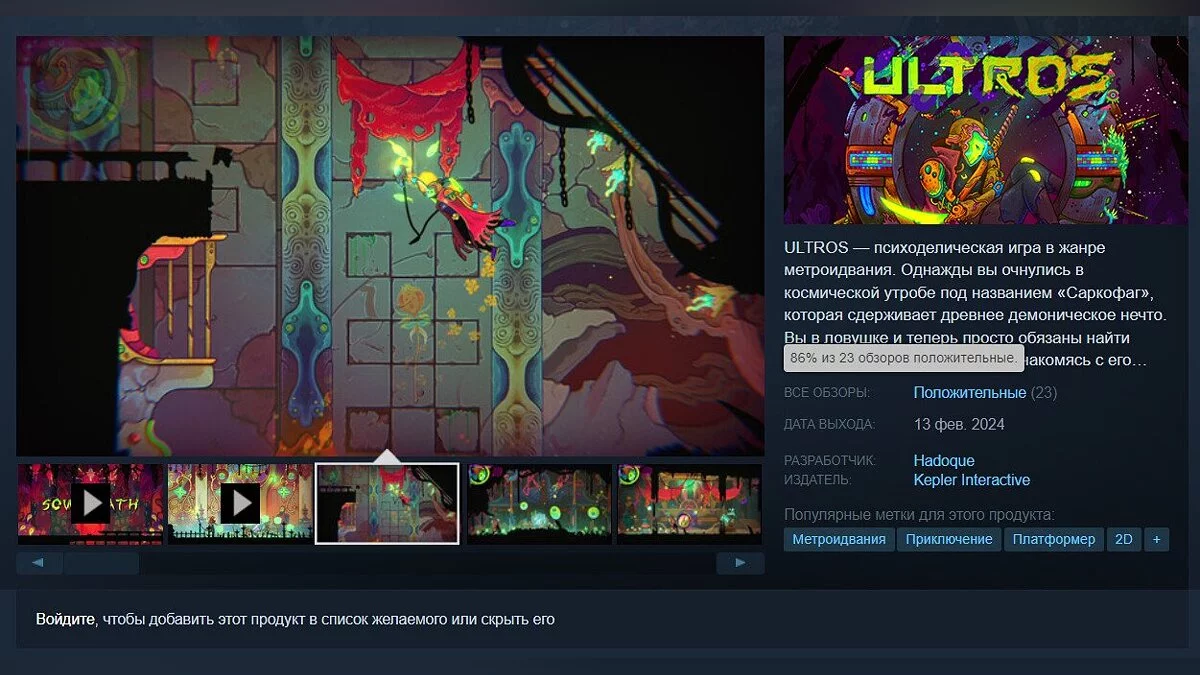 Купить Ultros в Steam можно за 1169 руб с учетом скидки 10% (действует до 20 февраля). Игра также продается в Epic Games Store и PS Store. Имеется бесплатная демоверсия.