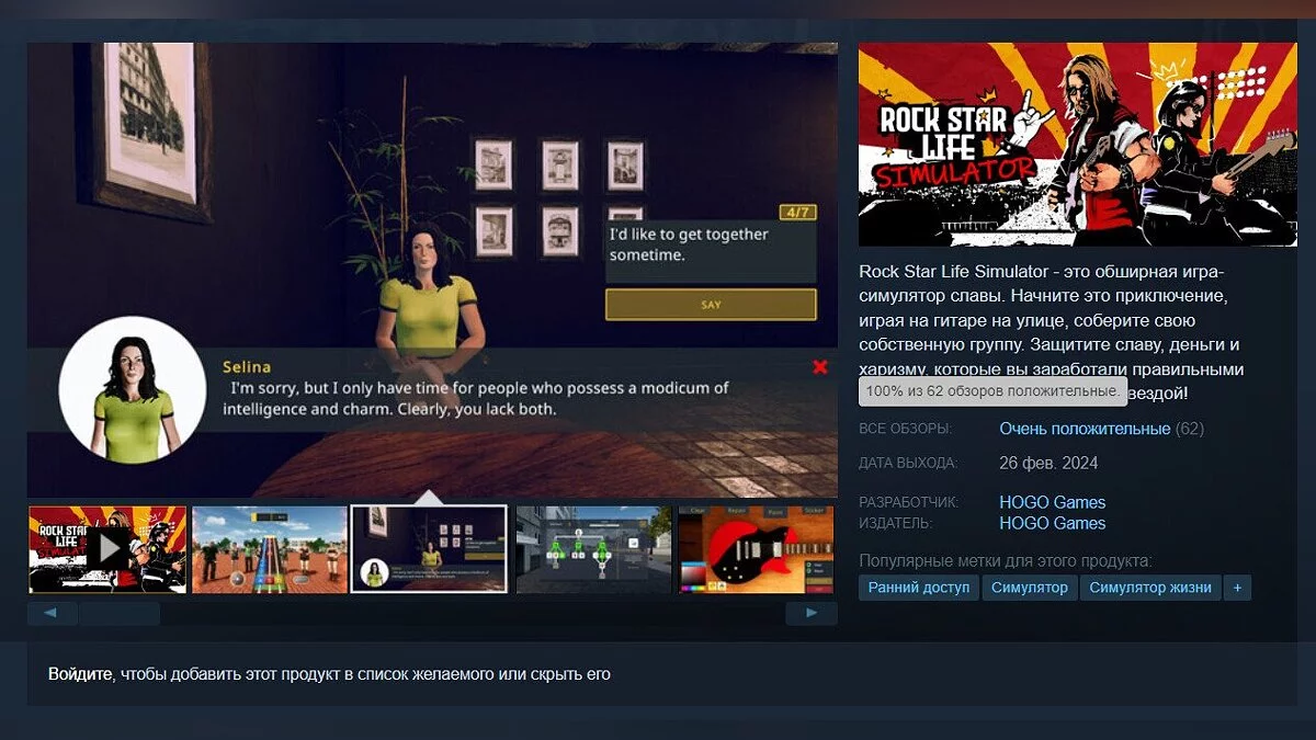 В раннем доступе Steam вышел симулятор жизни рок-звезды под названием Rock Star Life Simulator, который за первые сутки получил очень положительные отзывы. На момент написания новости рейтинг игры составляет 100%.