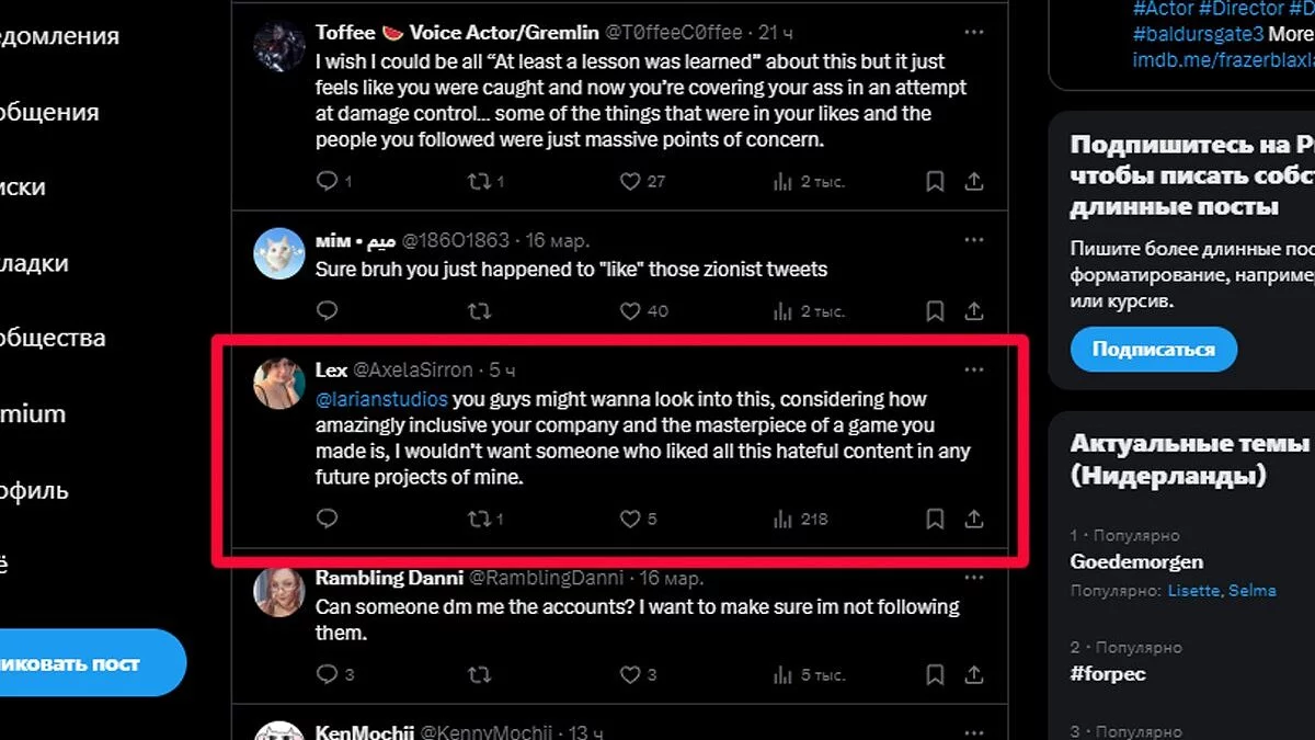 С некоторыми участниками команды Larian Studios известность сыграла злую шутку. Пользователи, массово подписываясь на аккаунты актеров озвучивания, заметили, что один из них лайкает «неполиткорректные посты».