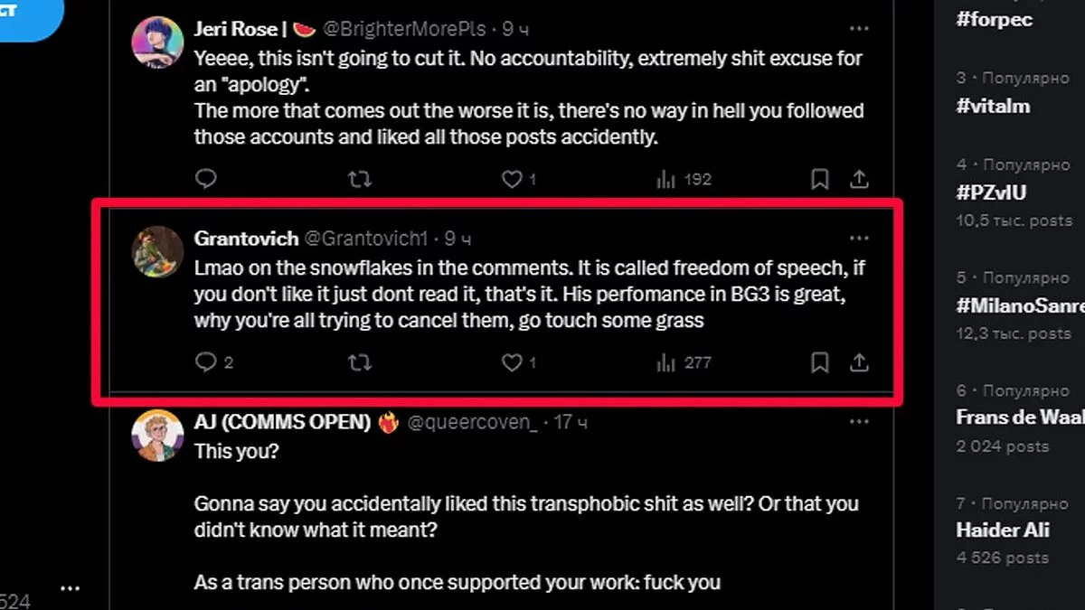 «Смеюсь с этих снежинок в комментариях. Это называется свобода слова, не нравится — не читайте, вот и все. Его работа в BG3 великолепна, почему вы пытаетесь его отменить, идите потрогайте траву», — пишет пользователь Grantovich.