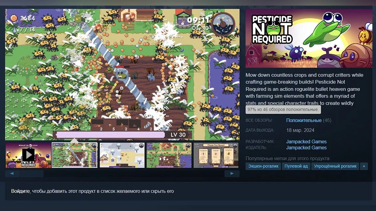 В Steam состоялся релиз игры под названием Pesticide Not Required, которая представляет собой смесь экшен-рогалика в духе Vampire Survivors и симулятора фермы в стиле Stardew Valley. На момент написания новости рейтинг проекта составляет 97%.