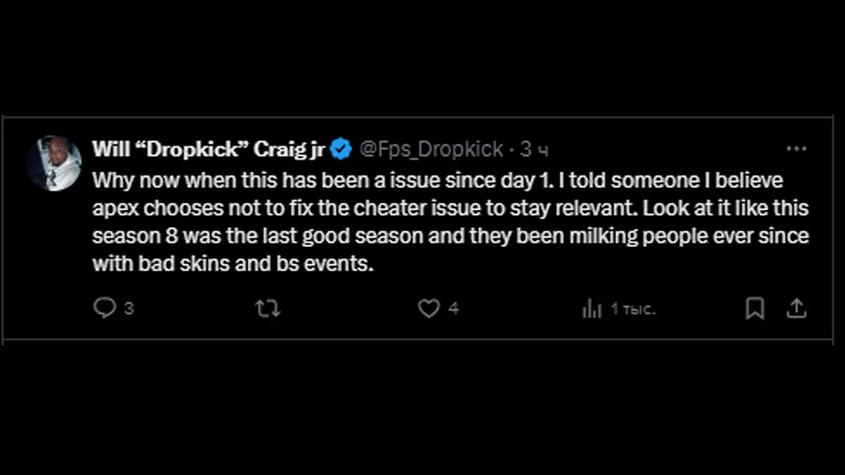 «Почему только сейчас, когда эта проблема с самого первого дня. По моему мнению, Apex предпочитает не исправлять проблему с читерами, чтобы оставаться актуальным», — написал пользователь Will «Dropkick» Craig jr.