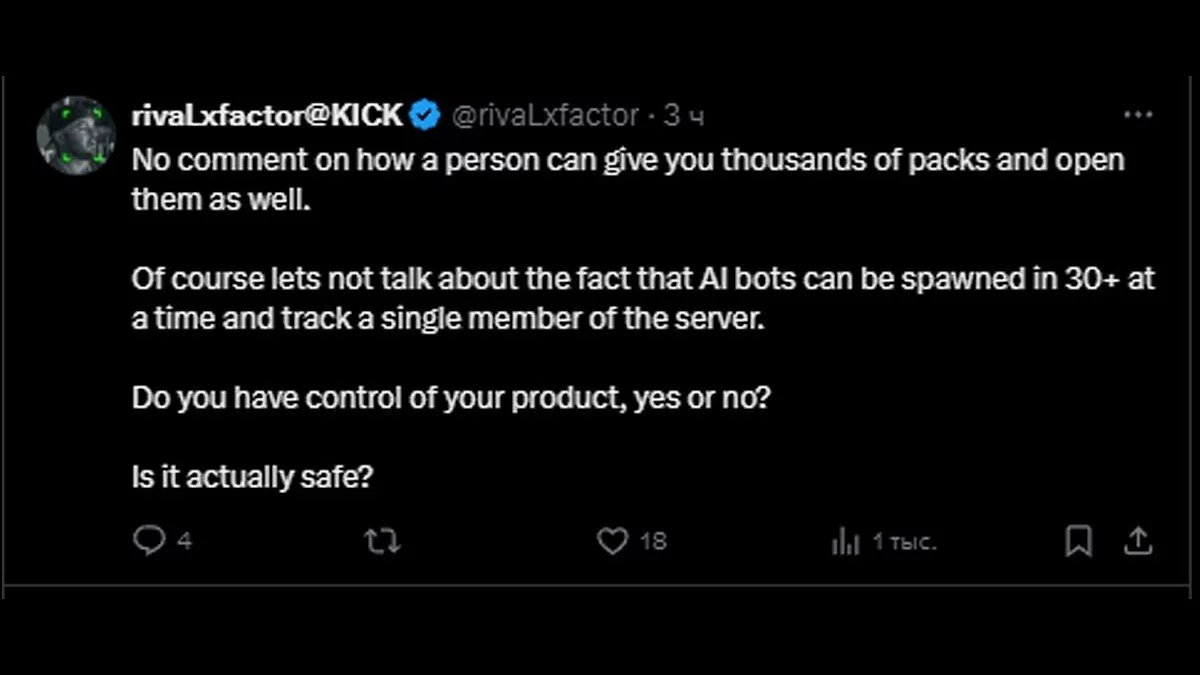 «Контролируете ли вы свой продукт — да или нет? Действительно ли он безопасен?», — спросил подписчик под ником rivaLxfactor@KICK.