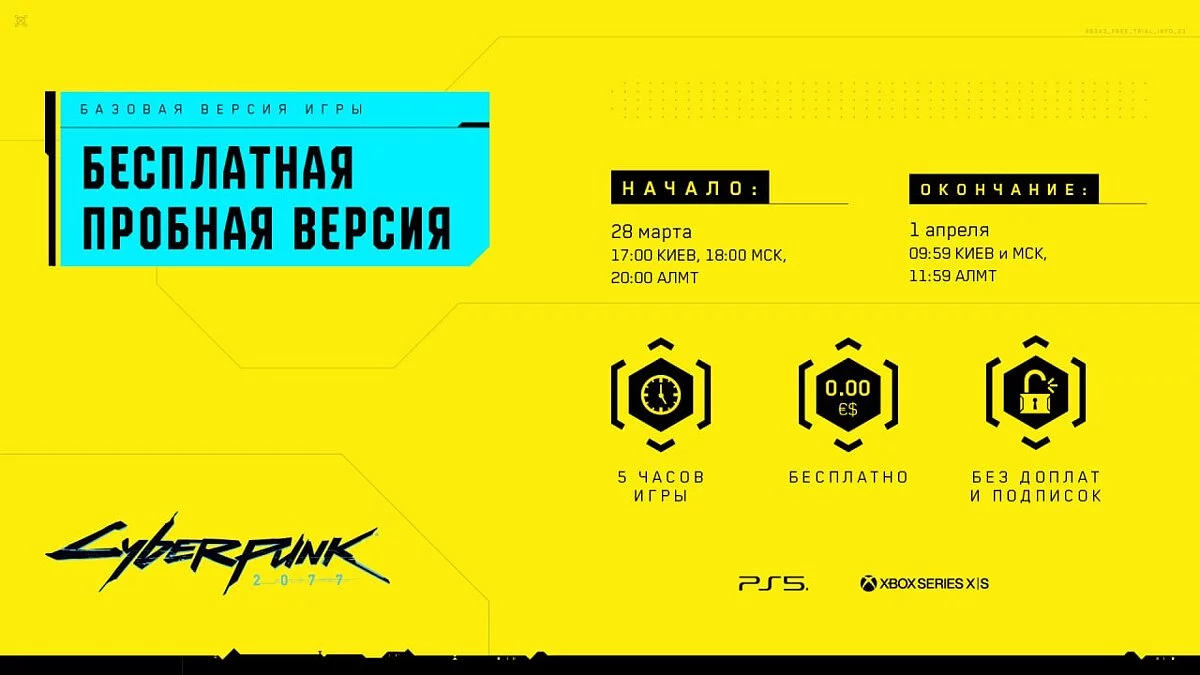 Компания CD Projekt RED выпустит бесплатную пробную версию Cyberpunk 2077 на консолях PlayStation 5 и Xbox Series X/S, в которой позволит провести 5 часов. Она будет доступна с 28 марта 18:00 (МСК) до 1 апреля 9:59 (МСК). Никаких подписок бесплатная версия не потребует.