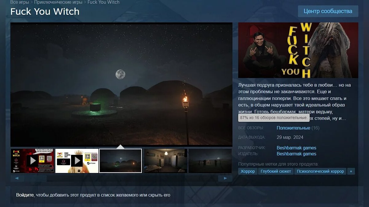 Студия Beshbarmak games выпустила в Steam хоррор под названием Fuck You Witch, в котором геймеры могут использовать русский мат, чтобы спастись от ведьмы. Первые отзывы — положительные (рейтинг 87% на момент написания новости).