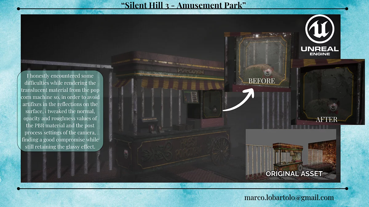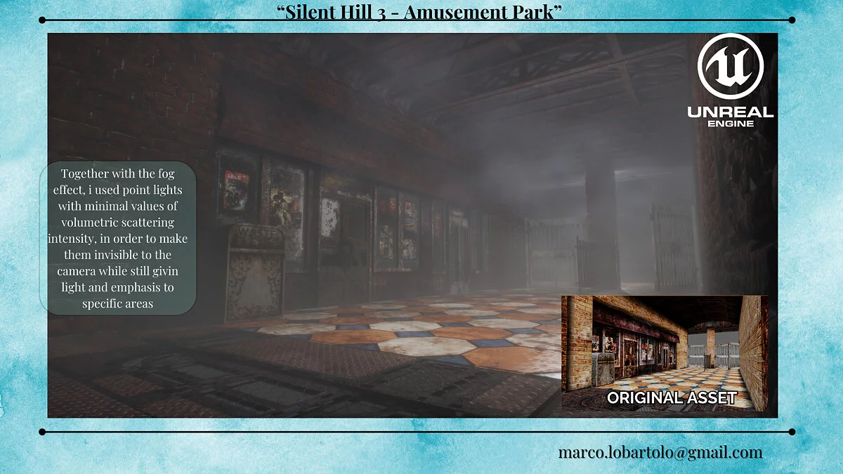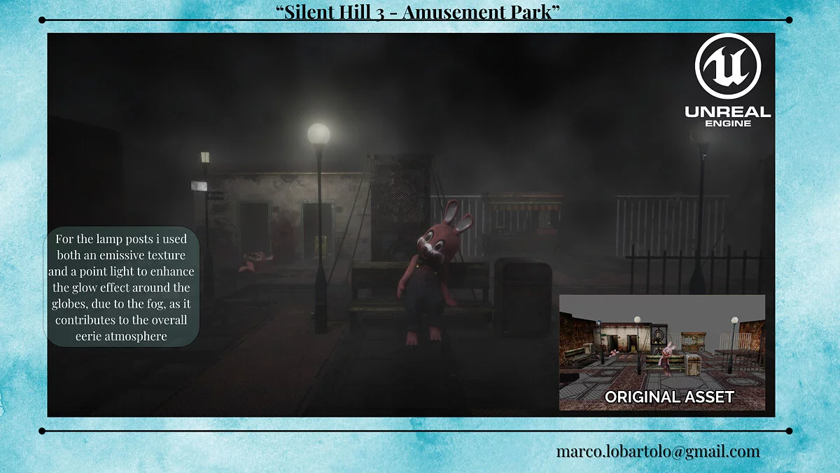 На создание этого проекта у меня ушло четыре недели: я делал каждый ассет с нуля, используя старую 3D-карту в качестве образца, чтобы создать современную копию окружения, максимально приближенную к оригиналу. Надеюсь, мне удалось воспроизвести ту очаровательную, но устрашающую атмосферу, типичную для серии.