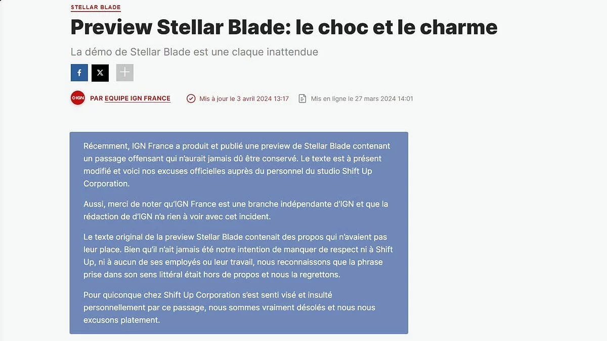 Отметим, что недавно IGN France все же извинилось перед студией Shift Up, разместив сообщение поверх скандальной статьи: