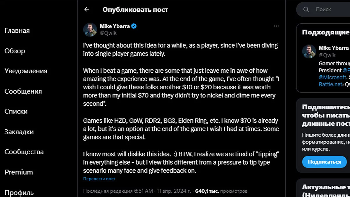 Бывший президент Blizzard Майк Ибарра (Mike Ybarra) предположил, что у геймеров должна быть возможность давать чаевые разработчикам. По его словам, так игроки могут выразить благодарность за игровой опыт.
